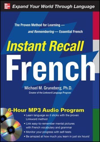 Learn and remember French words “A simple new way to increase your foreign-language vocabulary . . .” -Nada El Sawy, Newsweek Developed by memory expert Dr. Michael M. Gruneberg, Instant Recall French offers a proven method to help you build vocabulary and learn basic grammar instantly. All you need to do is listen, picture mental images, and then respond to the tests. The French for bakery is boulangerie. Imagine a bakery that sells underwear for bulls: bull lingerie; then keep this picture in your mind for about 10 seconds, until the next word is presented. After a set if 8 to10 words, you are tested on what you have learned. Within 10 to 12 hours, you will have a solid foundation of vocabulary and grammar to communicate confidently.