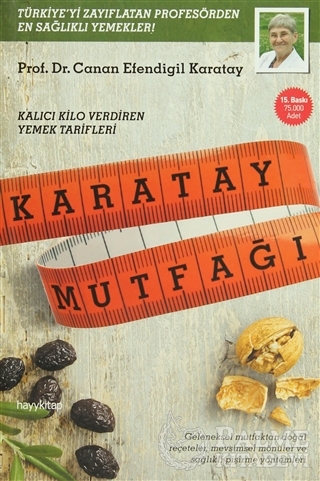 "Ben şunun garantisini veriyorum: Mutfağını, Karatay Mutfağı’na çevirenler sağlık bulacak, zayıflayacak ve kilosunu koruyacak! Bunu yaparken de hiç strese girmeyecekler." ‘Türkiye’yi zayıflatan profesör’ olarak ünlenen ve ilk iki kitabı satış rekorları kıran Prof. Canan Efendigil Karatay, bu kez sizin için ‘kalıcı kilo verdiren’ doğal ve lezzetli yemek tariflerini seçti. Karatay Mutfağı, Türk mutfağının en güzel örneklerini Karatay prensiplerine göre revize ederek sunuyor. Kitap adeta bir sağlıklı yaşam prospektüsü niteliğinde: Doğal ve temiz malzeme seçimi, sağlıklı pişirme yöntemleri, yoğurt, tereyağı gibi evde yapılabilecek doğal ürünlerin tarifleri... Ve çorbalardan salatalara, mezelerden yumurtalı yemeklere, zeytinyağlılardan et ve balık yemeklerine tamamı denenmiş onlarca leziz tarif. Küçük ‘tatlı’ kaçamaklar ve dinlendiren çay formülleri de hediyesi! Bu tariflerin en önemli özelliği ise zayıflatması... Çünkü hepsinin glisemik indeksi düşük. Yani Karatay Mutfağı, Karatay beslenme felsefesinin ‘pratik kitabı’ niteliğinde. Sürdürülebilir bir mutfağın olmazsa olmazı. Son sözü yine Prof. Karatay’a bırakalım: "Eşinin, çocuklarının, sevdiklerinin sağlığını (ve elbette kilosunu) düşünen herkesin bu kitabı okumasını ve tarifleri uygulamasını öneriyorum. Bu kitap ‘şişmanlıktan uzak’ sağlıklı nesiller yetiştirmek için önemli bir mihenk taşı. İlk iki kitabımla birlikte Karatay Mutfağı’na da kütüphanenizde mutlaka yer açın."