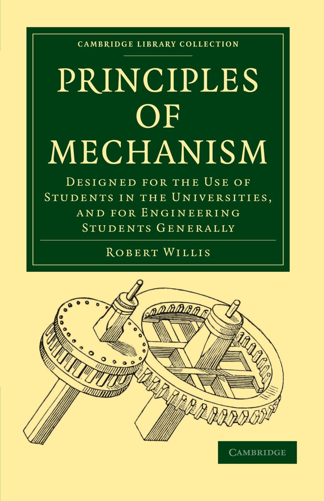 Robert Willis (1800–1875) was a scientist, inventor and architectural historian of international repute. As Jacksonian Professor of Natural and Experimental Philosophy at Cambridge, he demonstrated specially made mechanical devices to huge audiences. First published in 1841, Principles of Mechanism provided the theory behind the demonstrations. He defined mechanism as the means by which any relations of motion could be realised. The book was extremely influential, with all books in English, French, and German on the subject for the next generation adopting Willis' classification and nomenclature. He worked closely with William Whewell, whose Mechanics of Engineering was published in the same year. These two books established the science of mechanism, and provided study materials for the rapidly growing engineering profession. The work became a standard textbook for engineering and mathematics students, with a second edition issued in 1870.