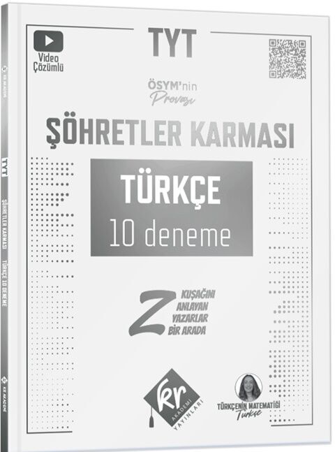 KR Akademi TYT Şöhretler Karması Türkçe 10 Deneme “ÖSYM deneyimi yaşatma” mottosuyla hazırlanan “Şöhretler Karması” alanında uzman, “Z Kuşağını Anlayan” onlarca yazarın deneyimlerinin sonucu olarak ortaya çıktı. Soruların zorluk derecesi ve soru kalıpları birebir ÖSYM tarzına göre belirlendi. Ayrıntılı çözümlere ulaşabilmeniz için tüm sorular detaylı bir şekilde çözüldü. Tek yapmanız gereken QR kodları okutup arkanıza yaslanmak. Aynı zamanda Z Kuşağınız Anlayan Yazarlar'dan Türkçenin Matematiği Şöhretler Karması TYT Türkçe Deneme için düzenleyeceği kampa bu kamplar için hazırlanmış özel QR kodu okutarak katılabilirsiniz.