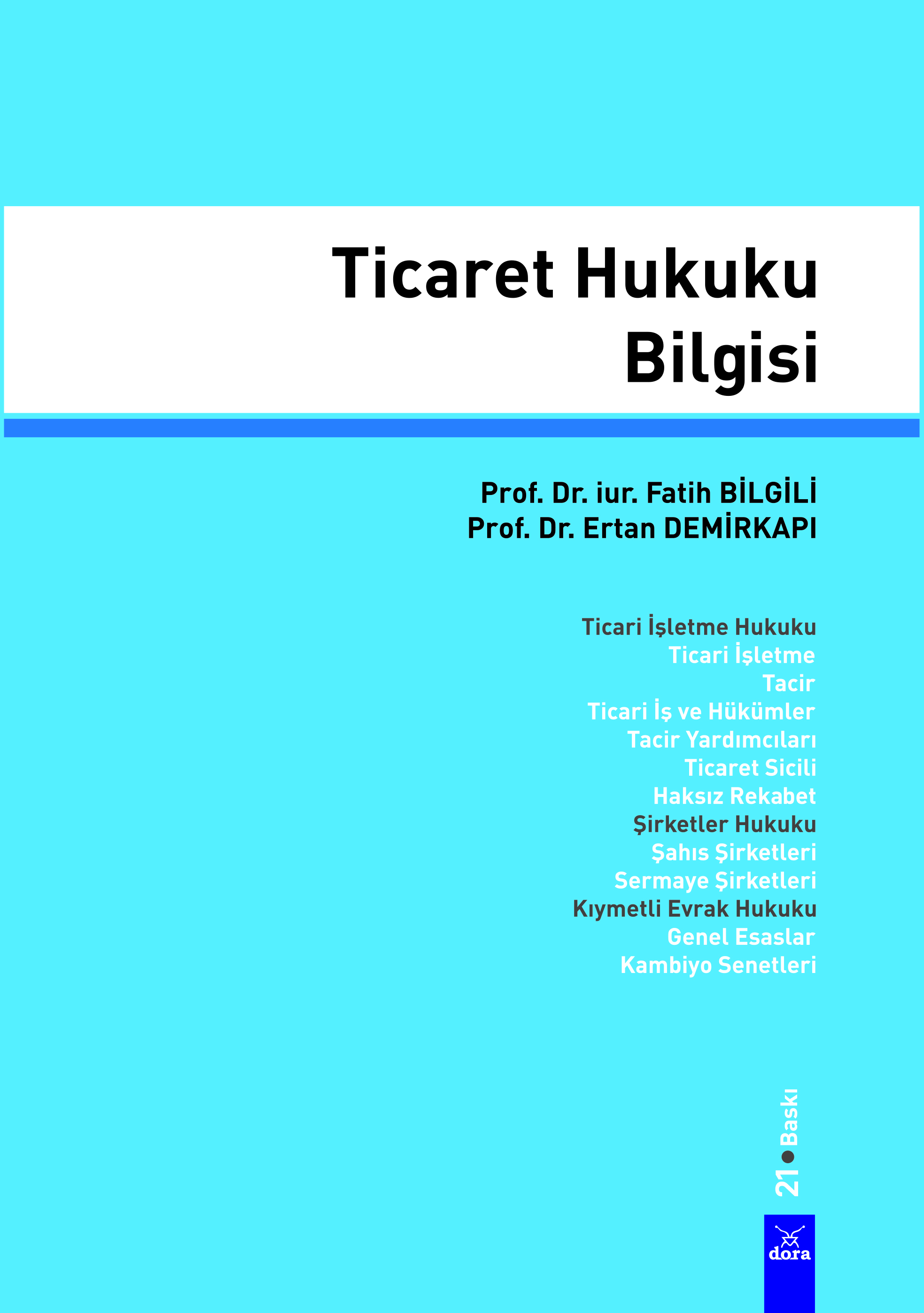 1.Ticaret hukukuna giriş 2.Ticari işletme 3.Ticari iş ticari hüküm ve ticari yargı 4.Tacir 5.Tacir yardımları 6.Ticaret Sicili 7.Ticaret unvanı işletme adı ve marka 8.Rekabet hukuku 9.Ticari Defterler 10.Cari hesap 11.Şirketler hukuku 12.Kıymetli evrak hukuku