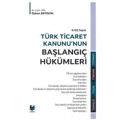 Bir seri halinde TTK'nun 1. Maddesinden son maddesine kadar tüm maddelerini ele alarak ve böylece TTK ve bağlantılı tüm mevzuatı, içtihatların sadece maddeyi ilgilendiren kısımlarıyla desteklemek niyetiyle kaleme aldığımız bu ilk kitabımızda 6102 Sayılı TTK'nun genel gerekçesini de eklemiş bulunmaktayız. Böylelikle daha geniş bir perspektifle genel gerekçenin ardından her bir maddenin kendi gerekçesini madde metninin altına ekledik. Nitekim genel gerekçede aynen şu ifadeler yer almaktadır; "Ticaret hukuku alanında Avrupa'da gerçekleştirilen büyük reformun niteliğine ve kapsamına ilişkin genel resmî görebilmek için, Alman, Avusturya, Fransız, İngiliz, İtalyan ve İsviçre hukukları ile AET/AT hukukunda yapılan değişikliklerin başlıcaları hakkında bilgi vermek, Tasarı ile getirilen değişiklikleri değerlendirmek yönünden yararlı olacaktır. " Nitekim genel gerekçede; "Almanya'da, birleşme, bölünme ve tür değiştirme, 1994 yılında bağımsız bir kanunun konusunu oluşturmuş, son olarak da 2004 yılında, yeni bir Haksız Rekabet Kanunu yürürlüğe girmiştir." İfadeleri ile ticaret hukukunun ne denli geniş bir konu olduğunu açıkça gözler önüne sermektedir. Konu Başlıkları TTK'nun Uygulama Alanı Ticari Hükümler Ticari Örf ve Âdet Ticari İşler Ticari Davalar, Çekişmesiz Yargı İşleri ve Delilleri Ticari Davalar ve Çekişmesiz Yargı İşlerinin Görüleceği Mahkemeler Dava Şartı Olarak Arabuluculuk Zamanaşımı Teselsül Karinesi Ticari İşlerde Faiz Oran Serbestisi ve Bileşik Faizin Şartları Uygulanacak Hükümler Faizin Başlangıcı