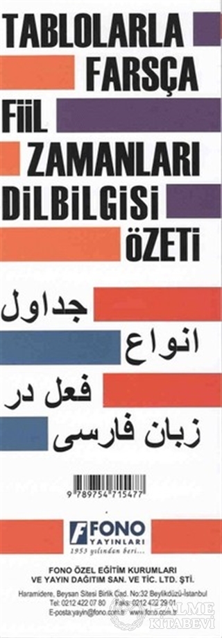 Farsça’yı öğrenmeye yeni başlayanlar için hazırlanmıştır. Farsça dilbilgisi özetini örnek cümlelerle anlatmıştır. Katlanır kortonet şeklinde olması her an elinizin altında olmasına kolaylık sağlamıştır.